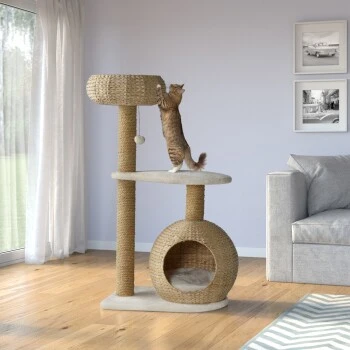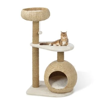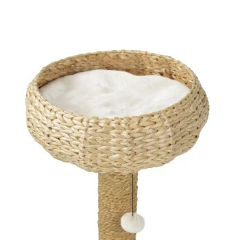 Sowohl die Höhle als auch die Stämme des AniOne Kratzbaums Saki sind aus natürlicher Wasserhyazinthe gefertigt, die dem Kratzbaum nicht nur sein hochwertiges und zeitloses Aussehen verleiht sondern zudem noch für eine hohe Luftdurchlässigkeit der Körbe sorgt. Auf den großzügigen Liegeflächen finden selbst größere Katzen bequem Platz. Die dazugehörigen Liegekissen bestehen aus kuschelweichem Plüsch und sind darüber hinaus einfach abnehmbar und waschbar. So schenkt der AniOne Kratzbaum nicht nur dank seines wunderschönen Aussehens und seiner natürlichen Materialien lange optische Freude sondern bietet Ihrer Samtpfote auch genau das was sie braucht: Verschiedene kuschelige Aussichtsplätze auf drei verschiedenen Ebenen und robustes, umweltfreundlicheres Sisal für ausgiebigen und langanhaltenden Kratzspaß.